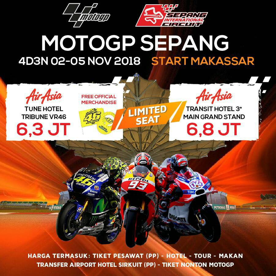 Lalu yang utama tentunya tiket nonton MotoGP itu. Bandung Tour Travel Agent Zoy Holiday kembali menawarkan Paket Tour Nonton MotoGP 2019 Sepang dan Tour Malaysia November 2019. Nih dia harga Tiket Nonton Motogp 2018.